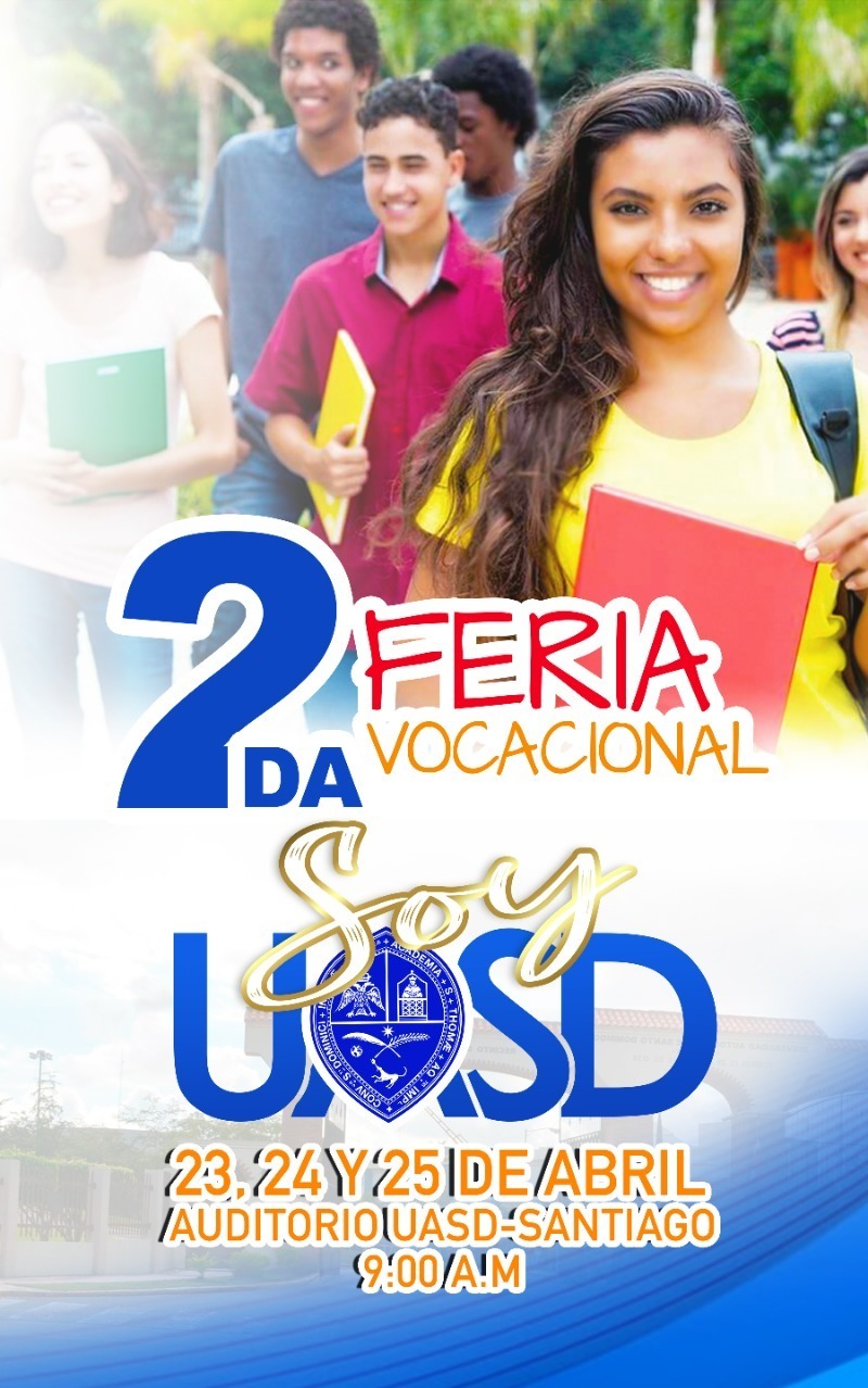 Santiago.-La Universidad Autónoma de Santo Domingo Recinto Santiago invita a la 2da Feria Vocacional "Yo soy UASD" los días 23, 24 y 25 de abril de 2024, a las 9:00 AM en la Biblioteca Juan Bosch.